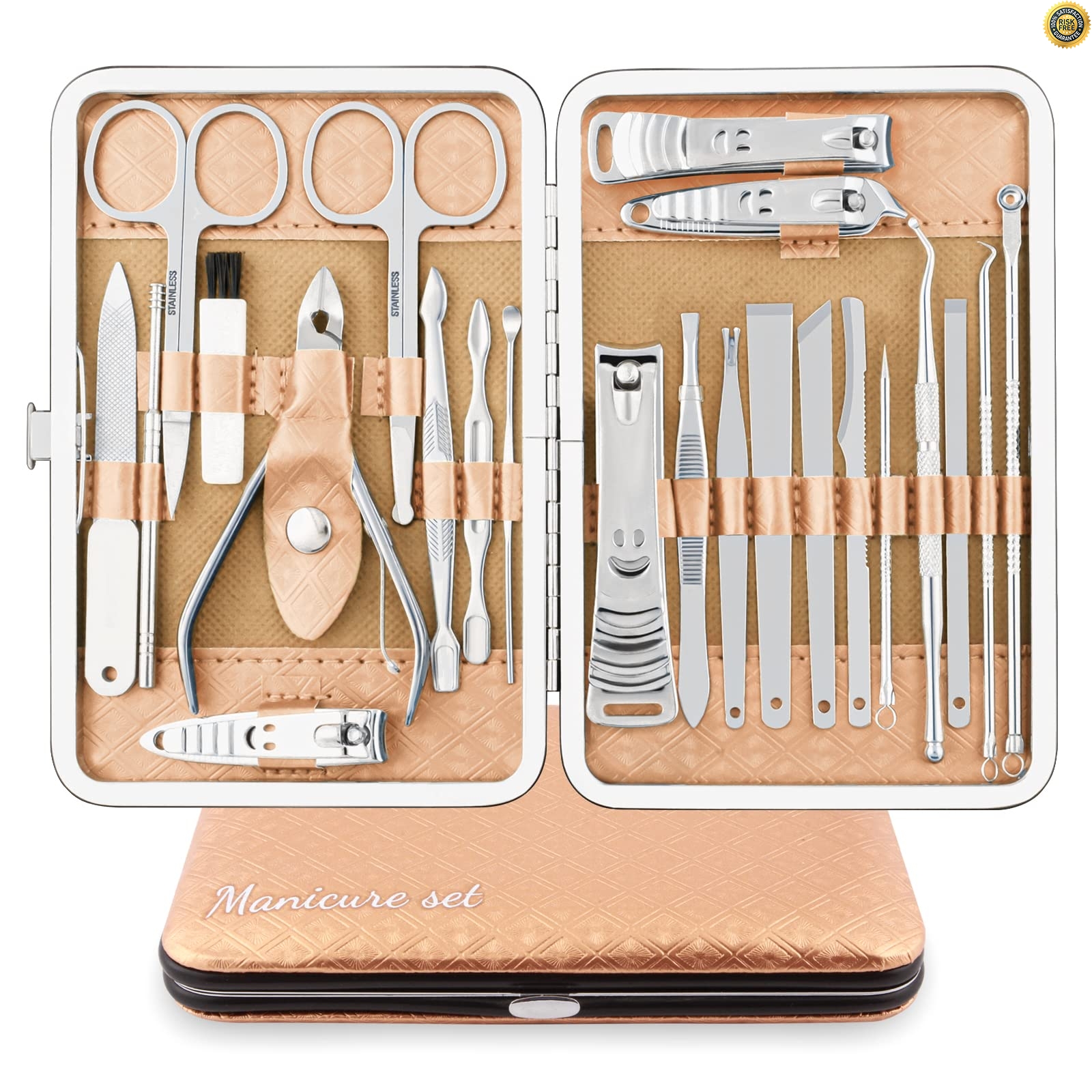 Stylish Design: The black PU leather box is very stylish and full of secrets, the interior stitching is neat and beautiful, and all the tools are made of silver craftsmanship, which is not only exquisite and unique but also looks luxurious. MULTIFUNCTIONAL: The 23-piece professional manicure set, including manicure, pedicure, eyebrow shaping, peeling, acne removal, etc., can meet various grooming needs in your daily life. Perfect as a gift for family and friends on Christmas, birthdays, anniversaries or Halloween. PORTABLE SIZE: As a compact and space-saving nail clipper case, you can take this beauty kit with you and put it in your handbag, car and luggage. An ideal gadget for at home and on the go. DURABLE: The nail art set is made of high-quality stainless steel, rust-proof, sharp and durable, the edge of each tool has been repeatedly polished and polished, and the blade is sharp and comfortable to hold.